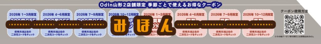 *このクーポンは、お会計合計金額301円以上の場合1回のみ、オーディン東根店、寒河江店でご利用いただけます。