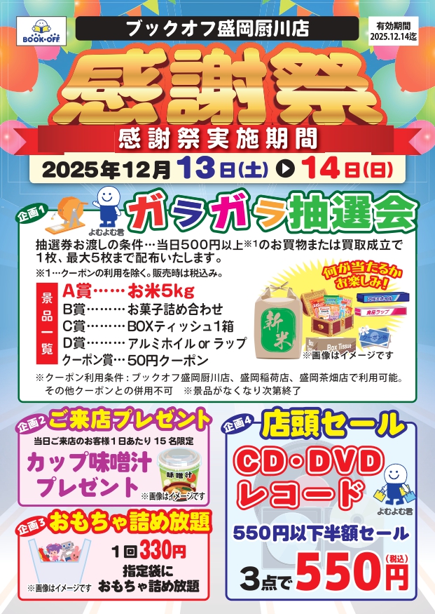 いつもブックオフ盛岡厨川店をご利用いただき誠にありがとうございます。この度、ブックオフ盛岡厨川店では日ごとの感謝を込めて、< 感謝祭 >を開催いたします。